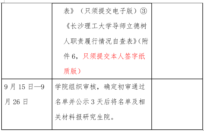 3.依据《落实研究生导师立德树人职责实施细则(试行)》规定,对导师立德树人职责履行情况进行审核。往年担任导师的校内申请者均需填写导师立德树人职责履行情况自查表,交学院审核。自查表中所列“七项职责”单项打分有3分以下者,学院将重点审核,有出现“十类失范行为”之一者,取消导师申报资格。