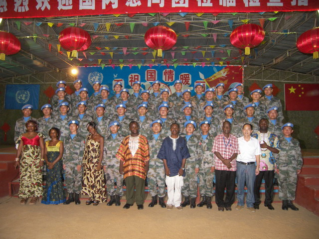 4月4日,以北京军区副参谋长武燕生少将为首的代表团抵达利比里亚首都蒙罗维亚慰问我国驻利维和部队官兵,我校孔子学院师生一行10人应邀到运输大队军营参加文艺晚会。孔院合唱团的演员们在晚会上成功地表演了情歌对唱《敖包相会》、女声独唱《映山红》和非洲风情舞三个精彩节目,赢来阵阵热烈掌声和喝彩声。部队首长在接见演员时连声夸赞孔院师生说:“唱得好!教得好!让中华文化发扬光大!”