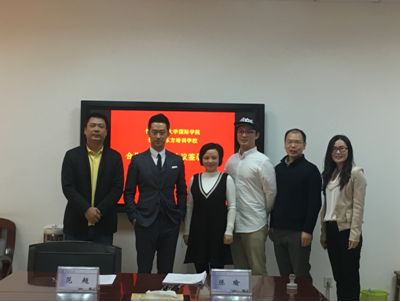 2017年10月20日上午10:00,国际学院与长沙市新东方培训学校在文科楼六楼签署双方战略合作伙伴框架协议。国际学院院长陈瑜、副书记兼副院长吴振华、院长助理秦卫星、学院大学生学习与发展中心汤路老师,新东方培训学校副校长兼国外考试部总监范超和国外考试部产品和教学负责人曾诗清老师出席了此次会议。