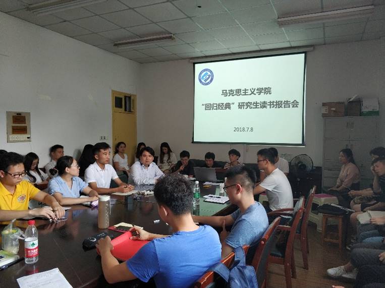 7月8日下午3点,马克思主义学院“回归经典”研究生读书报告会在金盆岭校区4教503隆重举行。马克思主义学院党委书记易显飞教授莅临现场指导,学院每个二级学科代表结合各自专业对阅读的经典进行汇报,17级全体研究生参加了此次活动。