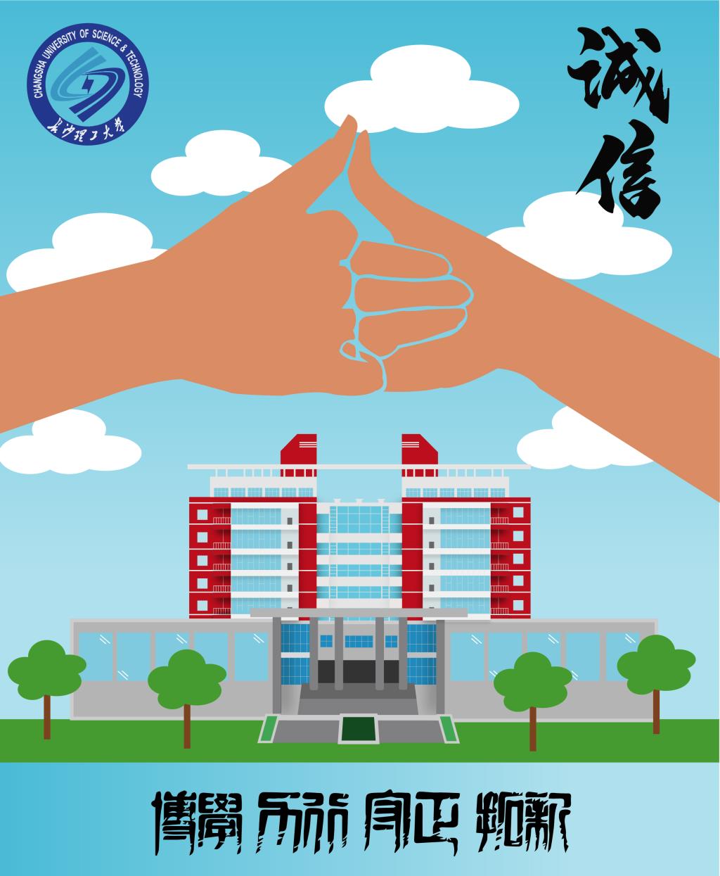 作品描述:画面由图书馆、拉钩的手、以及校训校徽组成,长沙理工“守正”的校训教导我们诚实守信,我国优秀传统文化中也有诚实守信的精神,图书馆可以代表校训和优秀传统文化。拉钩的手也代表守信。