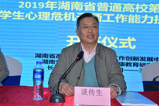 湖南省高校大学生心理健康教育研究会会长、副校长谈传生,湖南省教育厅思政处正处级调研员陈解莅临开班仪式并发表讲话。会长谈传生回顾近年我省心理危机干预工作的实际情况,总结省内各高校在心理危机干预工作中面临的困境和困难,指出建立一支专业化程度高、业务能力强的专职教师队伍,是推动危机干预工作专业化的迫切需求,通过做好心理危机干预工作,为学生构筑起“承重墙”,让他们健康成长成才,将来走向社会能够经得起各种考验。正处级调研员陈解在讲话中对一线心理健康教育专职教师在心理危机干预工作中面临的压力表示理解,提出当前高校大学生心理危机干预工作面临的严峻挑战,希望老师们把学到的理论知识运用到具体的工作中去,在工作实践上有新突破。开班仪式上湖南师范大学蒋佩老师作为学员代表进行发言,她认为本次培训内容专业性强,目标明确,在当前高校危机干预工作的严峻工作形势下,参加培训可谓雪中送炭,希望在培训中能学习有效的危机干预知识,提升工作技能和服务水平,能为百万学生的成长成才继续坚持前行。