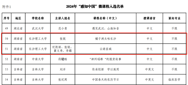 2024年“感知中国”微课程与实践基地评选是国家留学基金管理委员会“感知中国”活动实施十周年的系列活动之一,面向全国各类留学生招生院校申报。经学校推荐、专家审核等各环节,全国共有151个作品入选2024年“感知中国”微课程,65个基地入选2024年“感知中国”实践基地。我校国际工学院张锐老师主讲的《橘子洲头咏长沙》和纪凯丽、张锐、冀文秀、李璐老师联合主讲的《云游星城》成功入选“感知中国”微课程。我校联合湖南省宋旦汉字艺术博物馆申报的实践基地成功入选“感知中国”实践基地,作为全国首家汉字艺术主题博物馆,为国际学生提供了集汉字艺术研究创作、交流传播、陈列展示、体验互动、教育普及于一体的学习实践平台,帮助国际学生近距离感受汉字艺术之美,感知中华优秀传统文化。